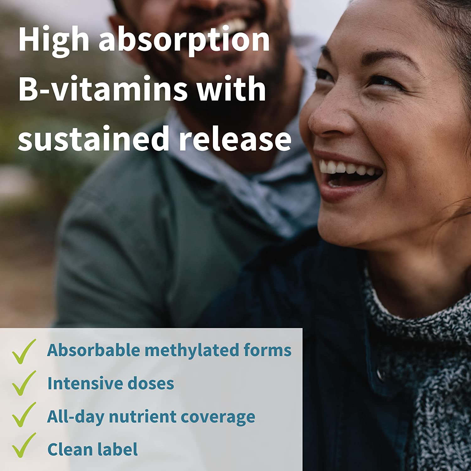 igennus super b complex methylated sustained release is the perfect multivitamin for anyone looking for a sustained release of all-day nutrient coverage. It is formulated with high strength, super absorbable B complex vitamins. It also provides intensive health support for energy metabolism, the immune and hormonal systems, homocysteine regulation, nutrient metabolism, heart function and psychological function.